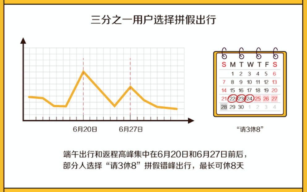 今年端午假期集中在周末,不少上班族會(huì)選擇“請(qǐng)3休8”拼假錯(cuò)峰出行,享受8天超長(zhǎng)假日。美團(tuán)大數(shù)據(jù)顯示,端午出行和返程高峰分別集中在6月20日和6月27日前后,三分之一用戶會(huì)選擇拼假出行。