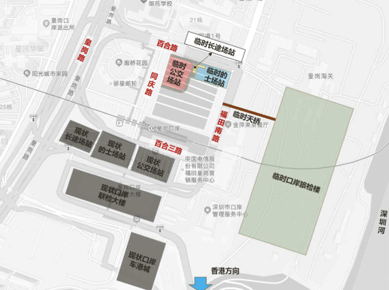 臨時(shí)口岸旅檢樓位于福田南路東側(cè),臨時(shí)交通接駁場(chǎng)站(公交場(chǎng)站、出租車場(chǎng)站、長(zhǎng)途客運(yùn)站)位于福田南路西側(cè)、百合路路南側(cè)。