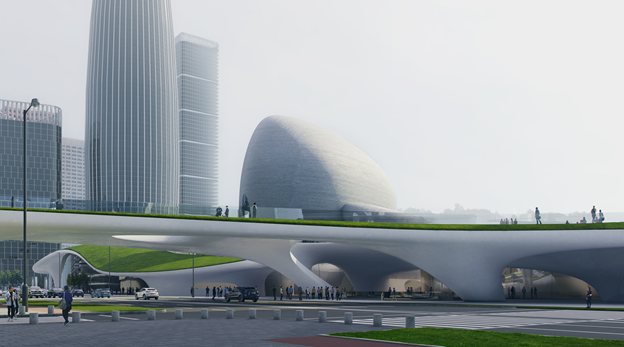 MAD的方案將較大體量的標準展覽空間、公共教育場地、圖書館、接待大堂、咖啡廳、配套商業(yè)等功能放置在首層并覆土,屋頂形成綠地與城市直接連接,構(gòu)成這個區(qū)域面積最大的公園。順應(yīng)建筑的曲線,屋頂坡度自然發(fā)展,柔和回落大地,接壤之處設(shè)計成數(shù)個下沉庭院,高低相合,延綿不斷。
