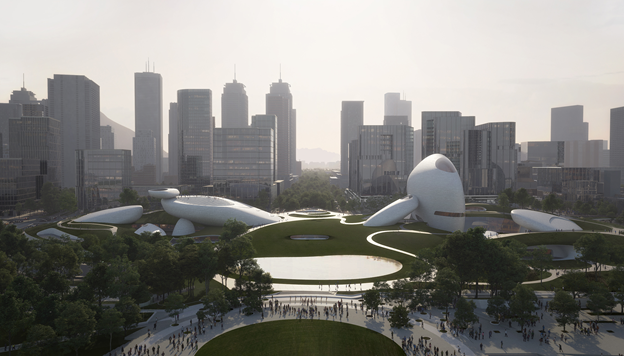 屋面覆土廣場、地景建筑以及地下公共展覽空間是主體