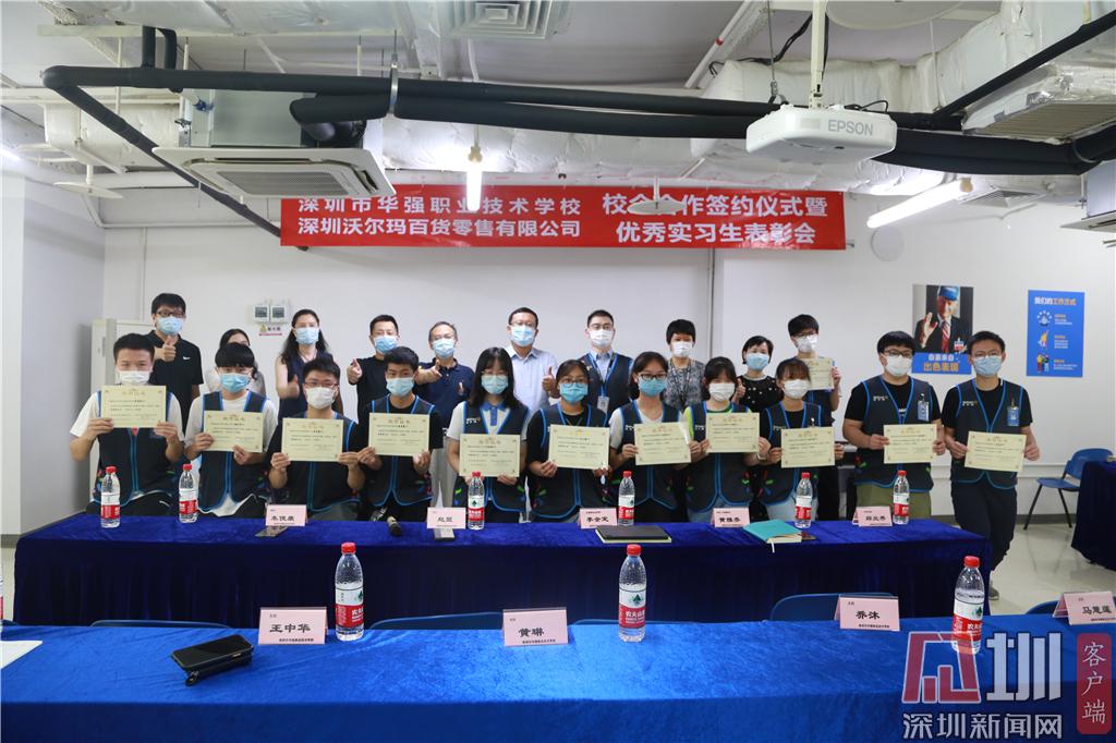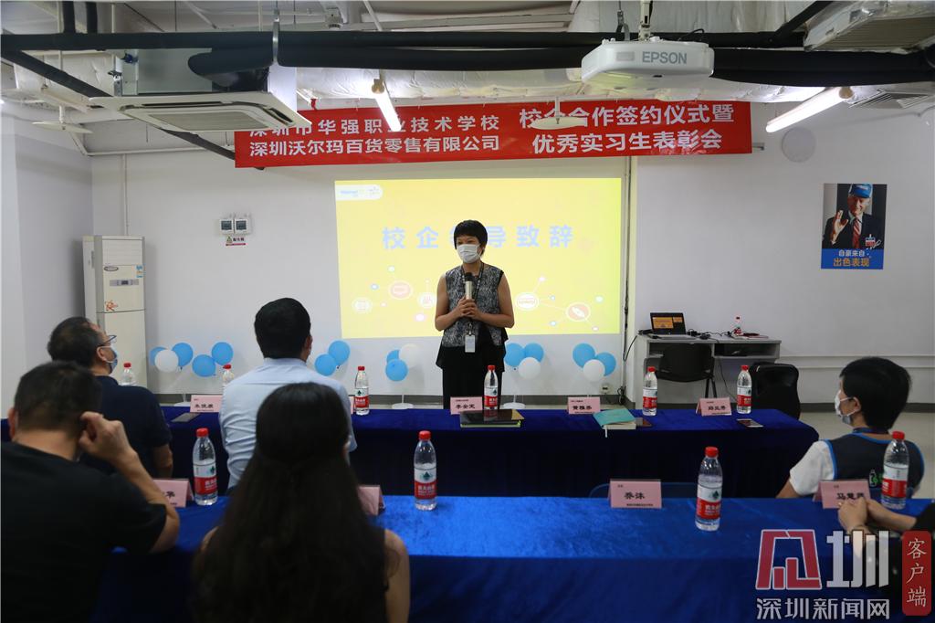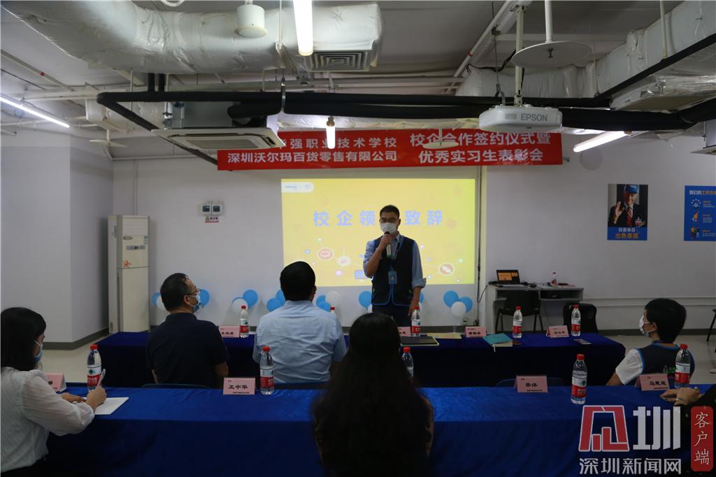 見圳客戶端·深圳新聞網(wǎng)2020年6月24日訊(記者 曹園芳 通訊員 沈琳 喬沐)昨天下午,深圳市華強(qiáng)職業(yè)技術(shù)學(xué)校與深圳沃爾瑪百貨零售公司簽訂校企合作協(xié)議。趙盟校長(zhǎng)、朱俊康副校長(zhǎng)、西校區(qū)王中華主任、校企合作辦黃琳主任、商貿(mào)部喬沐部長(zhǎng)、財(cái)經(jīng)部馬慧連副部長(zhǎng)、辦公室沈琳老師及學(xué)校優(yōu)秀實(shí)習(xí)生代表出席了簽約儀式暨優(yōu)秀實(shí)習(xí)生表彰會(huì)。