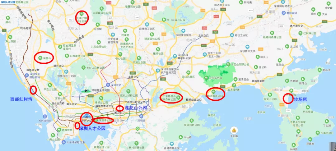 深圳灣公園、西灣紅樹林公園、蓮花山公園、深圳人才公園、世界之窗、光明小鎮(zhèn)花海、鳳凰山森林公園、梧桐山風(fēng)景名勝區(qū)和大、小梅沙海濱公園。