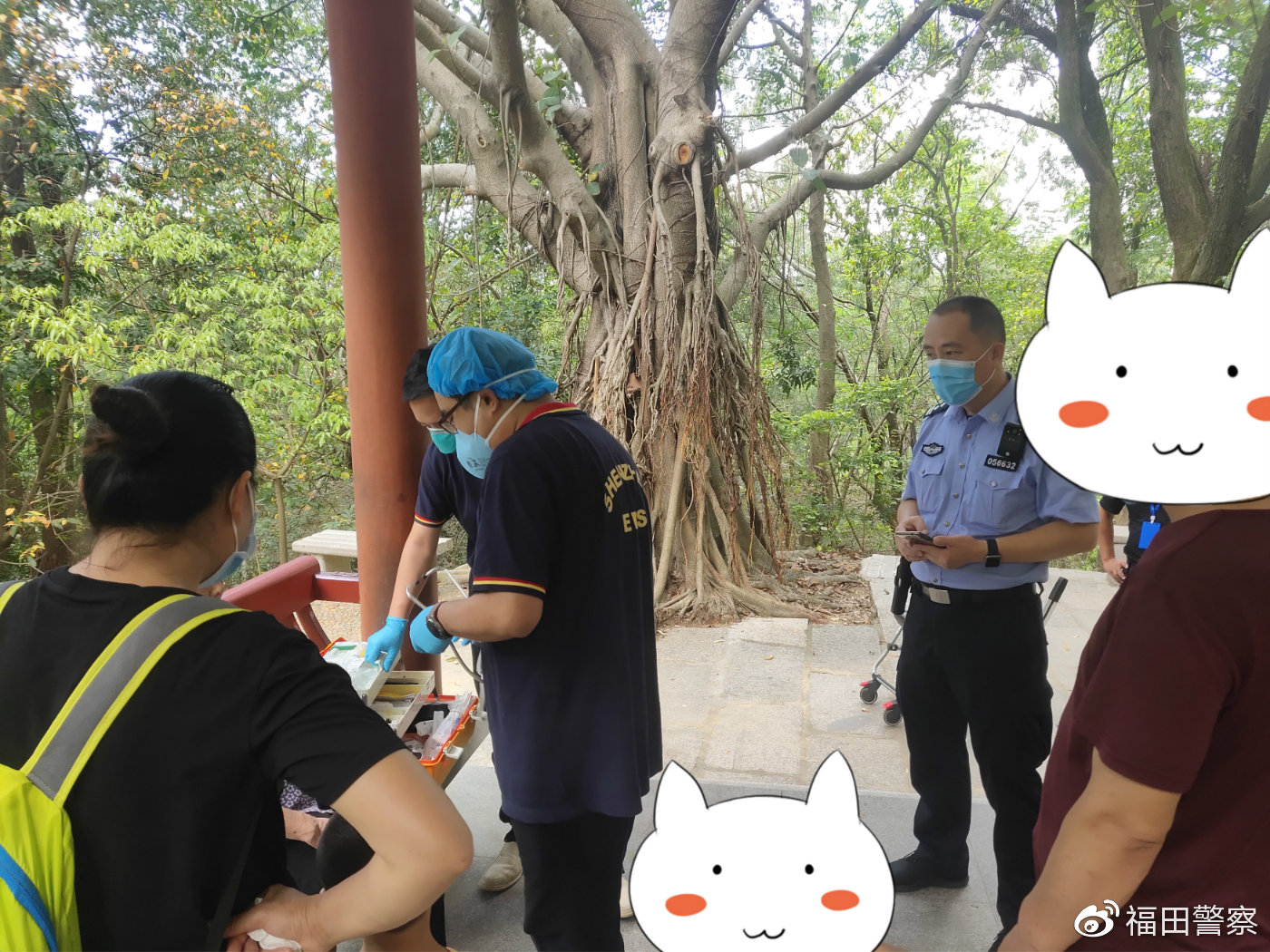13時許,接派出所前臺指令,報稱一老人身體不適請求幫助后,民警立即趕到現(xiàn)場,協(xié)助120醫(yī)務(wù)人員進行檢查。檢查完畢后,民警為老人遞上一杯水,并在確認(rèn)老人身體無礙后,將其護送下山。