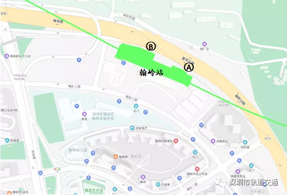 翰嶺站位于福田區(qū)翰林學(xué)校北側(cè)、梅觀路南側(cè),站位靠梅觀路南側(cè)大致呈東西向布置。該站為地下明挖兩層島式車站,共設(shè)出入口2個:A、B。