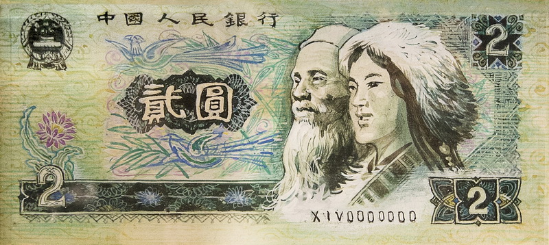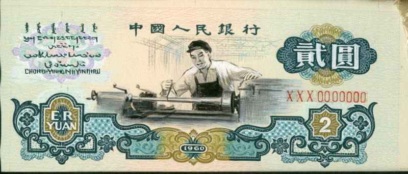 第三套人民幣2元票面總體設(shè)計手繪原大效果圖。