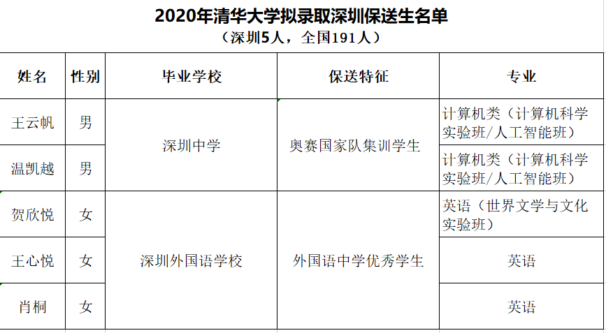 2020年清華大學(xué)擬錄取深圳保送生名單