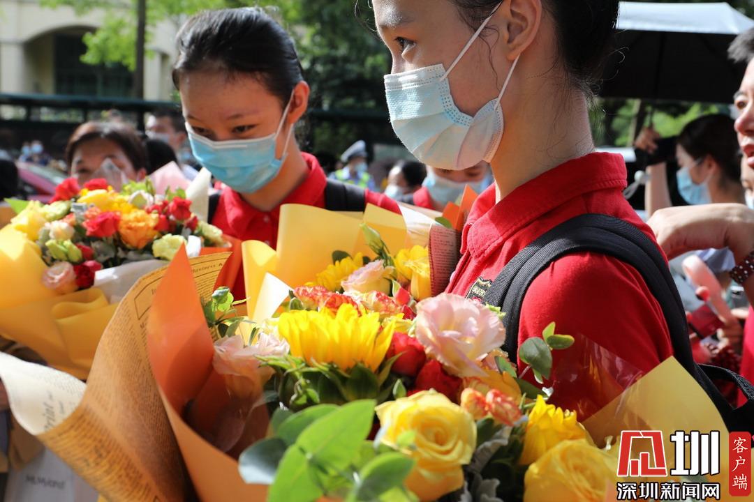 深圳高級(jí)中學(xué)考點(diǎn)外舞蹈隊(duì)學(xué)妹手捧鮮花,靜候?qū)W姐走出考場(chǎng)。