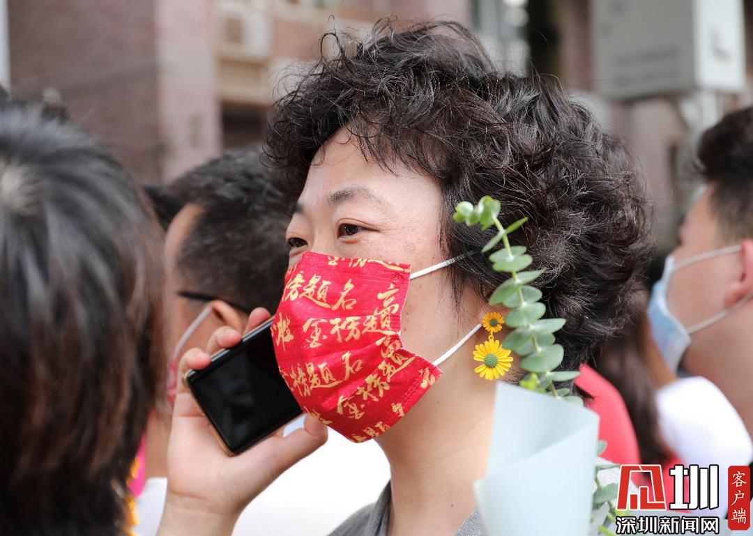 考點門口,家長戴高考必勝紅色“金榜題名”口罩。