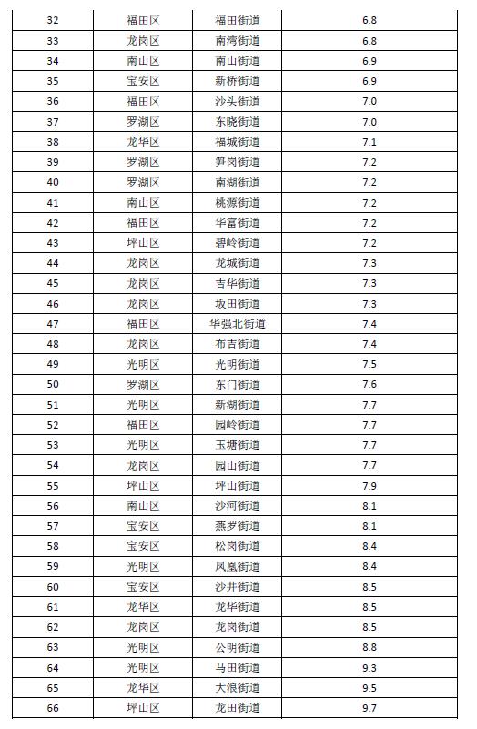 排名前十的街道是:福保街道、福海街道、海山街道、西鄉(xiāng)街道、南園街道、清水河街道、粵海街道、石巖街道、石井街道和蓮花街道;排名倒數(shù)后十的是:觀瀾街道、坪地街道、龍?zhí)锝值?、大浪街道、馬田街道、公明街道、龍崗街道、龍華街道、沙井街道和鳳凰街道。