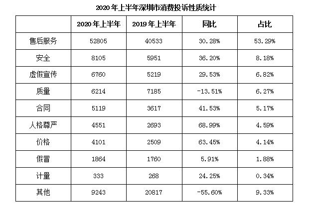 根據(jù)《情況分析》,2020年上半年,深圳市消委會收到的消費(fèi)投訴問題性質(zhì)最多的為售后服務(wù),共52805宗,占比53.29%;其次為安全問題,共8105宗,占比8.18%;第三是虛假宣傳問題,共6760宗,占比6.82%。有關(guān)人格尊嚴(yán)問題、價(jià)格問題的投訴量與2019年相比均同比上漲超過60%;有關(guān)質(zhì)量問題的投訴量與2019年相比均有所下降。