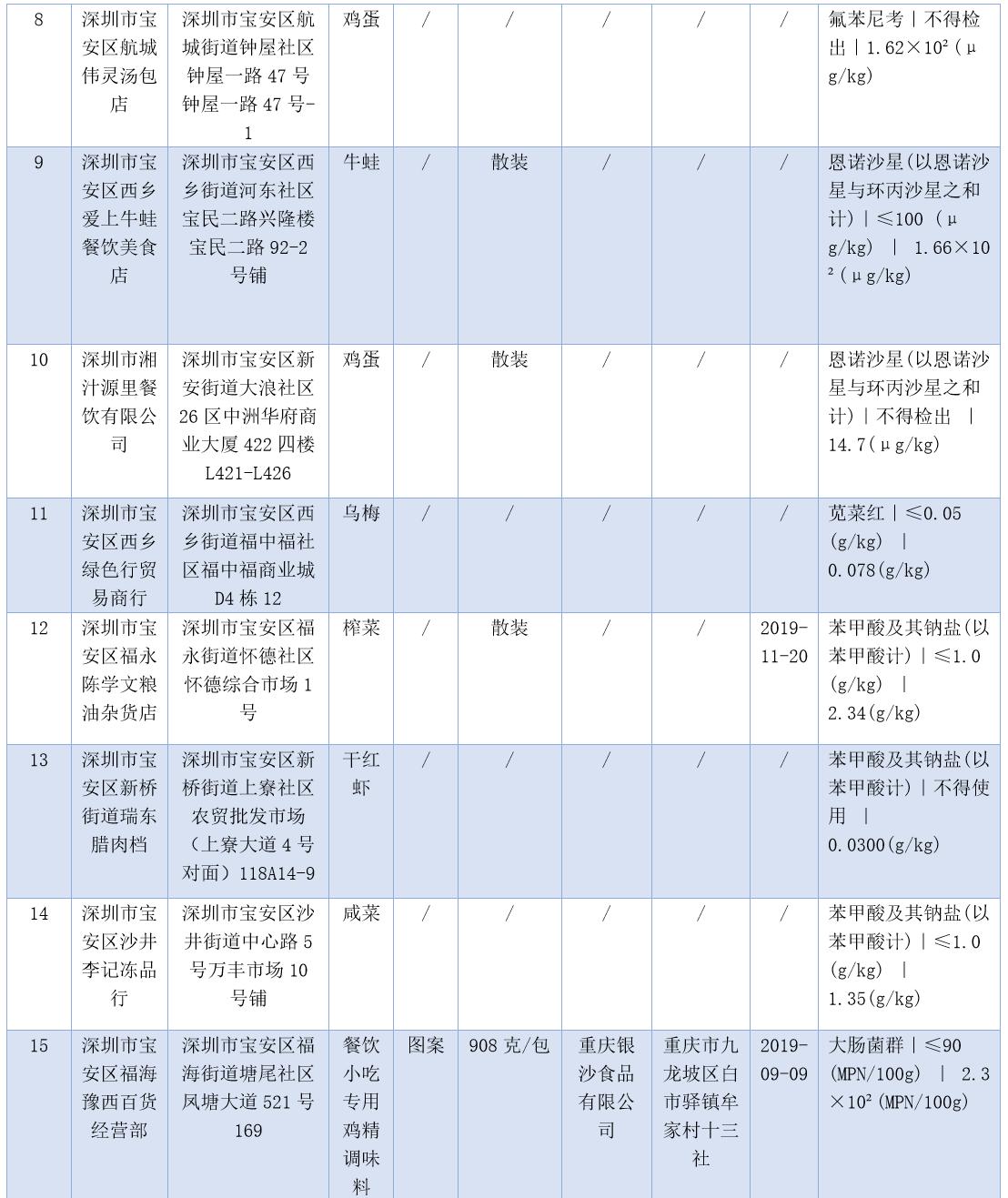 見(jiàn)圳客戶端·深圳新聞網(wǎng)2020年7月17日訊(晶報(bào)記者 鄧裴裴/制圖)7月17日,深圳市市場(chǎng)監(jiān)督管理局官網(wǎng)發(fā)布了2020年第二十二期食品安全抽樣檢驗(yàn)情況通報(bào),3-5月,共抽檢生產(chǎn)、流通、餐飲環(huán)節(jié)食品1229批次,發(fā)現(xiàn)不合格樣品47批次。記者注意到,不少不合格樣品抽檢單位為餐飲店,包括皇軒酒店、窯雞王、愛(ài)上牛蛙、御可奶茶等,還有些小吃店、腸粉店、螺獅粉店紛紛上榜。涉及不合格項(xiàng)目類別包括農(nóng)藥殘留、獸藥殘留、食品添加劑、微生物污染、品質(zhì)指標(biāo)、金屬等元素污染物。