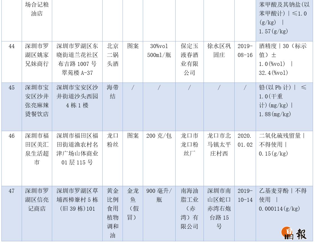 本次不合格樣品涉及的食物種類較多,臘腸、雞蛋、榨菜、酒等都檢出問(wèn)題,值得注意的是,羅湖區(qū)草埔西樟輋村信亮記商店出售假冒的金龍魚油,檢出了不得使用的乙基麥芽酚,其標(biāo)稱生產(chǎn)企業(yè)為南山區(qū)南海油脂工業(yè)(赤灣)有限公司,后經(jīng)核實(shí),不合格產(chǎn)品非該公司生產(chǎn)。