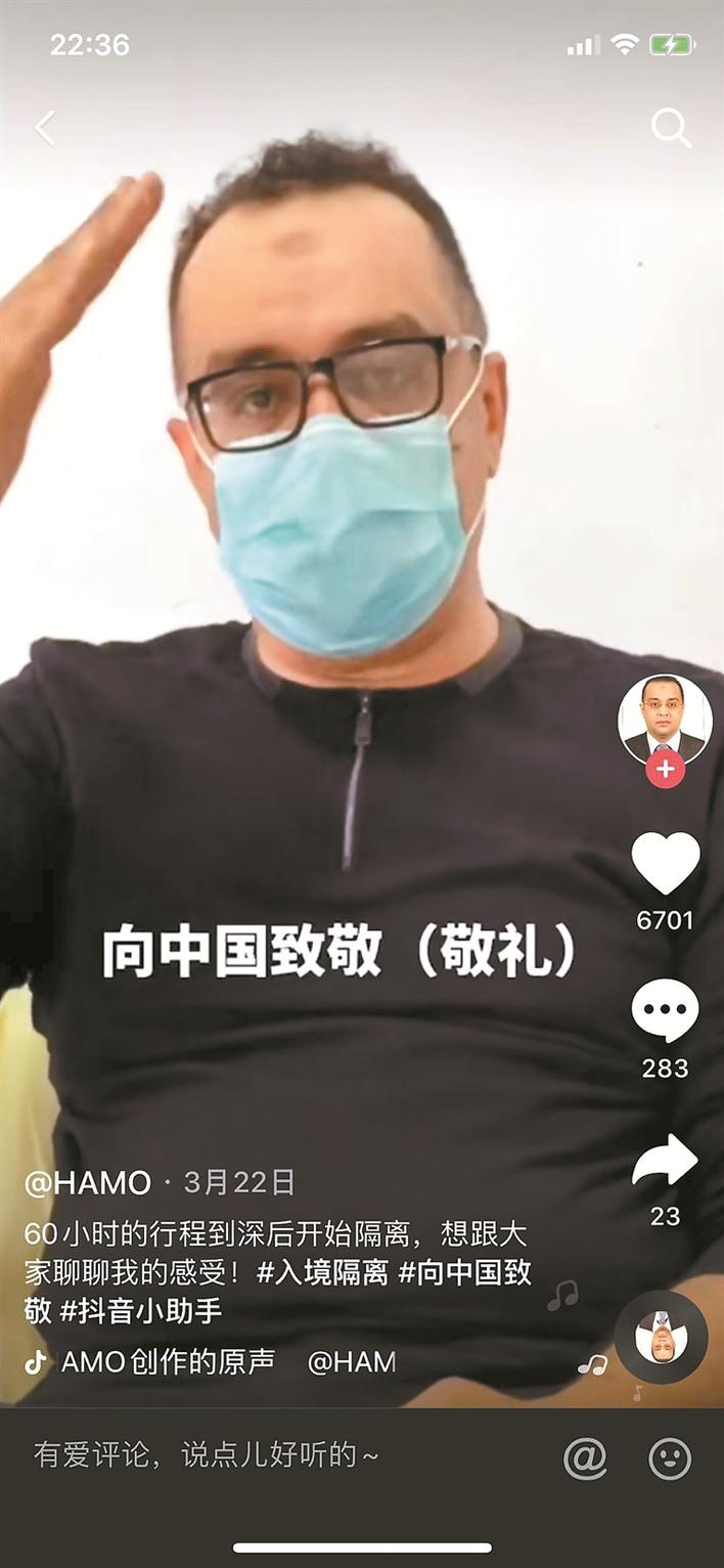 在方哈默所有抖音視頻中,點贊量最高的是對中國防疫工作兩次真情的致敬,他希望能借此呼吁所有入境人員都能百分之百遵從政府安排。“我希望能有更多人可以看到中國的防疫措施?!狈焦谝曨l中說道,“中國所有的防疫工作者都很贊,他們24小時不間斷工作,你根本想象不到有多辛苦,我希望每個入境人員都百分之百遵守政府的安排?!彼麧M懷信心地表示,接下來也會把在羅湖的抗疫短視頻拍下去,希望借此機會可以把中國的聲音傳到更遠的地方,向世界傳遞中國力量。