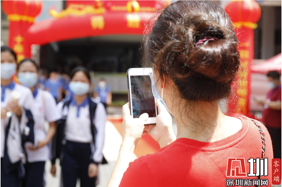 一位家長正在給走出考點(diǎn)的女兒拍照留念。