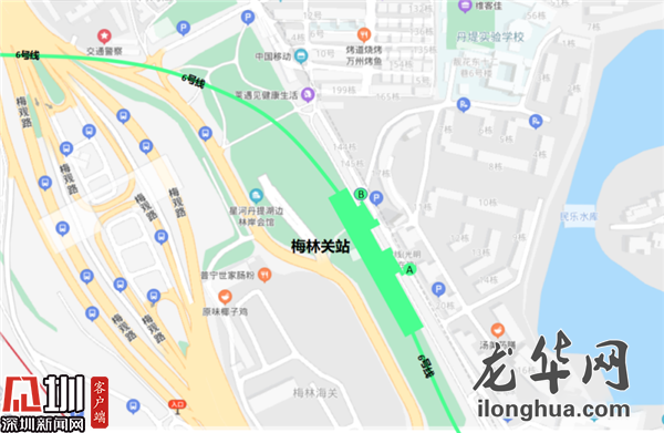 梅林關(guān)站位于梅觀路與豐澤湖小區(qū)之間綠化帶內(nèi),整體與梅觀路平行,呈南北走向,車站南端頭至星河丹堤小區(qū)內(nèi),北端頭至梅林關(guān)檢查站出關(guān)口處,西側(cè)緊靠梅觀路。