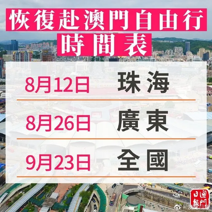 一、自8月12日起,廣東省珠海市公安機關出入境管理部門恢復辦理珠海市居民(含居住證持有人,下同)赴澳門旅游簽注;如無特殊情況,8月26日起,廣東省公安機關出入境管理部門恢復辦理廣東省居民赴澳門旅游簽注;在內地與澳門疫情形勢繼續(xù)總體向好的前提下,全國公安機關出入境管理部門于9月23日起恢復辦理內地居民赴澳門旅游簽注。