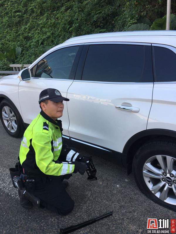 事情發(fā)生在10月11日早上10時(shí)30分許,劉先生駕車出外辦事,車輛行駛至東環(huán)高架西往東方向時(shí),突然一聲巨響左后輪輪胎爆裂車輛半路拋錨,當(dāng)時(shí)正值交通早高峰,過(guò)往車輛不斷,故障車輛停在道路中間導(dǎo)致路段交通擁堵,車主劉先生一時(shí)間不知所措,只能留在原地等待救援。此時(shí)正在執(zhí)行巡邏任務(wù)的羅湖交警鐵騎組長(zhǎng)陳展廷見(jiàn)狀,立即停下警車上前查看情況,了解情況后,為了緩解該路段的交通擁堵,防止出現(xiàn)交通意外,陳展廷立即讓劉先生把車??吭谧钣覀?cè)車道,然后安排隊(duì)員用警車在故障車輛周邊設(shè)置出了安全警戒區(qū)域,另一位隊(duì)員則對(duì)過(guò)往車輛進(jìn)行指揮疏導(dǎo)及勸慰駕駛?cè)瞬灰?,在安全區(qū)域等待,陳展廷則俯下身為爆胎車輛更換輪胎。約15分鐘的忙碌后,三位鐵騎隊(duì)員已滿身是汗,但在他們的密切協(xié)調(diào)配合下,快速幫助駕駛?cè)藙⑾壬鷶[脫困境,險(xiǎn)情在最短時(shí)間內(nèi)被及時(shí)排除,道路交通秩序也恢復(fù)正常,這暖心一幕讓劉先生很是感動(dòng),緊緊握著陳展廷同志的手連聲表示感謝。