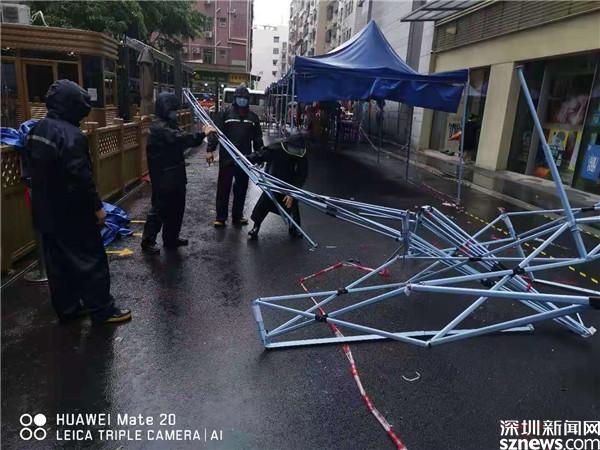 6月22日早上,黃貝街道工作人員在風雨中搭建核酸檢測點帳篷。