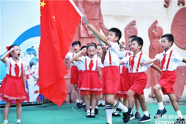 蓮南小學(xué)的開學(xué)典禮上,二(8)班少先隊員在國旗下,用生動活潑的歌舞,表達(dá)對新學(xué)期的期待,對黨的熱愛。