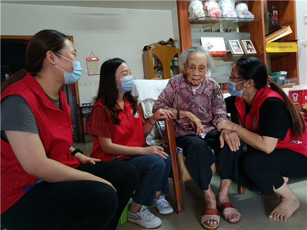 在鐘錦云老人家里,85歲的鐘阿姨挨個跟年輕的社工握手,一口一個乖女,笑著說:“你們真乖啊,又來看鐘姨了,謝謝你們啊。”這兩年,社工經(jīng)常登門看望,她總是喜歡叫社工乖女,與社工談笑間親如家人。社工轉(zhuǎn)達(dá)了社區(qū)黨委對老人的問候,并祝老人中秋快樂。分別時,老人不舍地將大家送到樓梯間,一再叮囑有空就來玩。