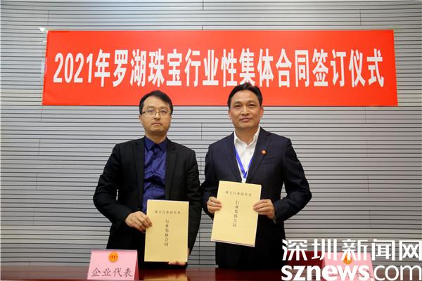 值得一提的是,本次大會還融合了職工權(quán)益保障、文明城市創(chuàng)建、企業(yè)服務(wù)等內(nèi)容。在大會現(xiàn)場,舉行了“2021年羅湖區(qū)珠寶行業(yè)集體合同簽訂儀式”。簽訂儀式上,區(qū)珠寶工聯(lián)會主席、集體協(xié)商首席代表曾志斌和羅湖區(qū)珠寶企業(yè)協(xié)商首席代表周曉航共同簽訂了《2021年羅湖區(qū)珠寶行業(yè)集體合同》,切實保障了轄區(qū)珠寶企業(yè)職工合法權(quán)益;隨后,由“廣東省五一勞動獎?wù)隆鲍@得者郭夷錟宣讀了主題為《攜手新征程,共創(chuàng)新未來》的行業(yè)倡議書,號召全區(qū)珠寶企業(yè)和職工,在深入學(xué)習(xí)貫徹習(xí)近平新時代中國特色社會主義思想、愛崗敬業(yè)、敢為人先、誠信經(jīng)營等方面爭做表率;同時,為更好地服務(wù)轄區(qū)企業(yè),大會特地邀請了羅湖區(qū)企業(yè)服務(wù)中心陳良同志為與會代表介紹企業(yè)服務(wù)平臺建設(shè)與運用情況。