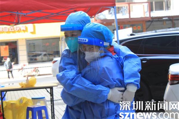 1月11日,深圳突然降溫,風(fēng)大天冷。北風(fēng)呼嘯中,羅湖區(qū)桂園街道老圍社區(qū)禧程酒店的臨時(shí)檢測(cè)點(diǎn)帳篷差點(diǎn)被掀翻。寒風(fēng)刺骨,社區(qū)工作人員和志愿者有條不紊地引導(dǎo)市民有序采樣。工作人員在“風(fēng)口浪尖”上站得久了,被吹得全身透涼,手指頭都冷僵了。瞬間,兩名志愿者緊緊擁抱在一起,相互取暖,以示鼓勵(lì)。隨后,又立刻回到各自崗位,投入緊張的工作中。