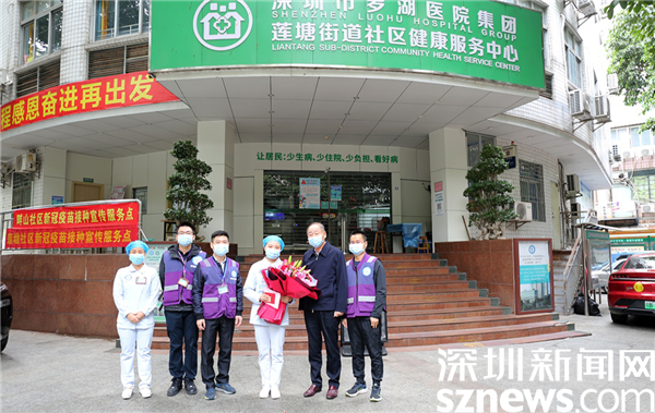 1月13日是王津原定舉行婚禮的日期,她仍然沒有例外地出現在蓮塘社康的采樣隊伍中。盡管不能出現在婚宴現場,但是并肩作戰(zhàn)的社康同事給王津錄了一個祝福視頻給她祝賀,羅湖醫(yī)院集團黨委書記、院長孫喜琢也來到蓮塘社康,向依然堅守崗位的新娘王津送上了鮮花和新婚祝福,感謝她的辛勤付出,并對所有在抗疫一線的醫(yī)務工作者表示感謝,“是你們在守護羅湖、守護深圳的安全,你們辛苦了!”