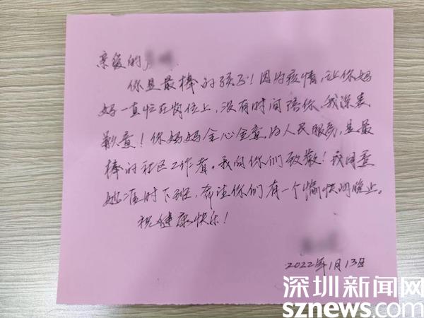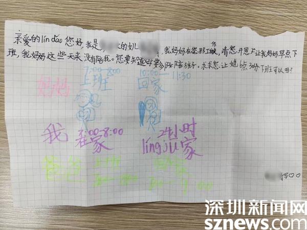 讀特客戶端·深圳新聞網(wǎng)1月13日訊(見習(xí)記者 覃鈺清 通訊員 張晴晴)“親愛的lín dǎo您好……我媽媽在您那工作,這些天都沒能陪我,請你讓她6點30分下班可以嗎?”,1月13日,羅湖區(qū)南湖街道羅湖社區(qū)黨委書記姜德榮收到了一封特別的來信。這封信來自社區(qū)工作人員彭女士可愛的女兒,信上的內(nèi)容圖文并茂,表達了一個10歲小女孩的小心愿,希望媽媽可以早點下班,回家陪她。