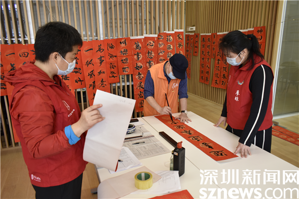 寫(xiě)春聯(lián),是筆尖上歷久彌香的年味,是記憶里紅紅火火的祝福,是民俗中傳承的瑰寶?;顒?dòng)現(xiàn)場(chǎng),書(shū)寫(xiě)春聯(lián)的劉老師熱情高漲,筆落有序,書(shū)寫(xiě)過(guò)程行云流水、一氣呵成,一幅幅空白對(duì)聯(lián)在他們執(zhí)筆揮舞的手中仿佛也有了生氣。而身穿紅色馬甲的義工們則將書(shū)寫(xiě)好的春聯(lián)進(jìn)行晾曬、收集、打包,大家分工合作,井然有序。愿這一副副在巧手下出爐的寓意平安和諧、吉祥如意的春聯(lián),一張張紅彤彤的“福”字,給社區(qū)居民帶去春的溫暖、年的祥和。