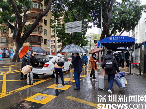 上午8:00左右,深圳市羅湖高級中學高三學子陸續(xù)返校。大雨雖然下個不停,但是學生們返校的心情卻絲毫沒有受到影響。在校門口,老師、學校物業(yè)工作人員為學生們撐傘、對行李進行消毒、協(xié)助掃碼填報信息,有序幫助學生接過行李并用小推車運送至宿舍樓。“這次開學和以往開學有所不同,我的感觸也很深。下著大雨,老師們忙前忙后為我們運送行李,覺得非常感動。”羅湖高級中學高三學子張睿說道。