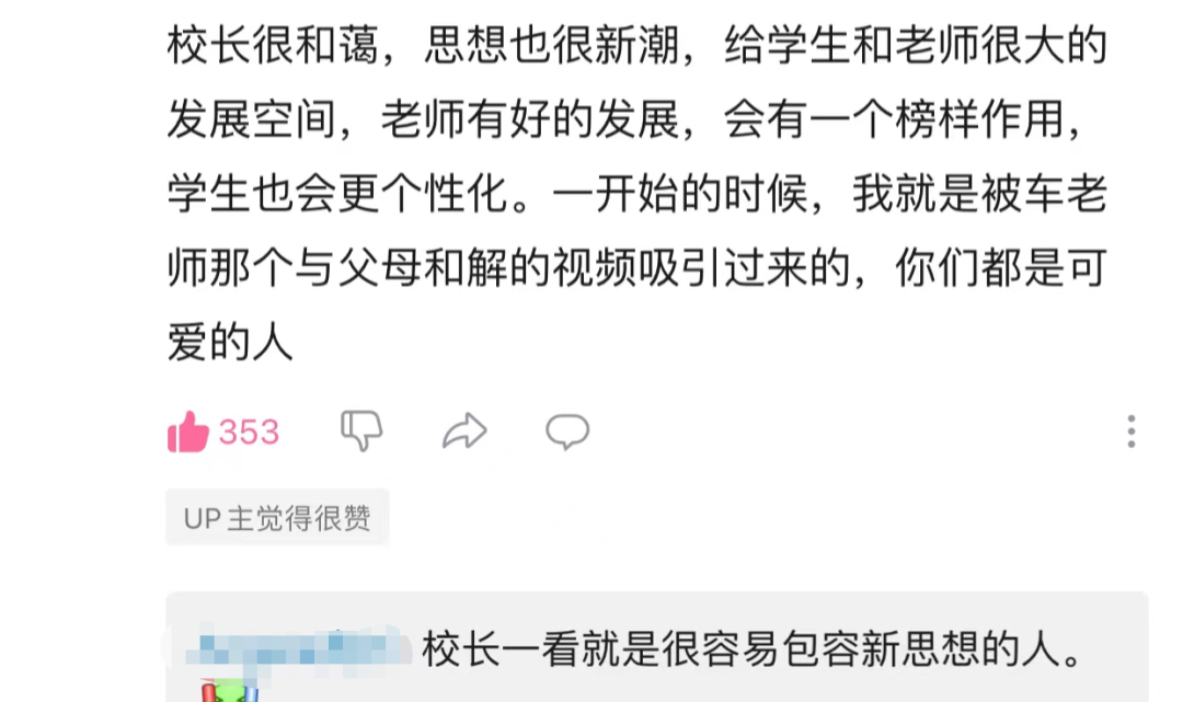 如今,許多學(xué)校老師也在做自媒體,黃潔表示,不反對老師們在完成本職工作的情況下,有一些興趣愛好和個(gè)人發(fā)展?!袄蠋焸冇凶约旱陌l(fā)展,然后把這些能力和資源再帶回到學(xué)校,給學(xué)生更多的滋養(yǎng)和熏陶,是一件很好的事?!贝嗽捯怀?,不僅“車棍兒老師”感動(dòng)得直呼:“這就是校長的格局!”網(wǎng)友們也表示這就是別人家的校長啊!