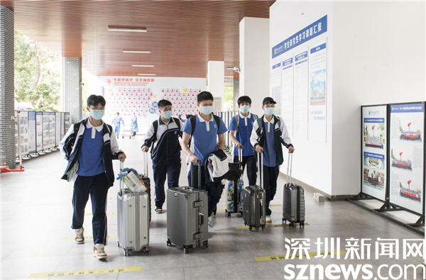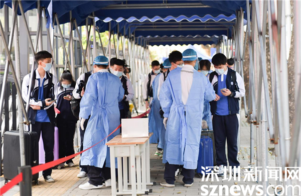 當(dāng)天早上,在羅湖高級中學(xué)校門口,學(xué)校老師、校醫(yī)、義工家長等早早來到校門口,迎接同學(xué)們的到來,每個(gè)同學(xué)都自覺戴好口罩,間隔一米距離,背著書包,拖著行李箱,進(jìn)入學(xué)校前出示???、粵康碼綠碼、行程卡以及24小時(shí)核酸陰性證明,并進(jìn)行衣物、行李、鞋底和手部消毒等。在經(jīng)歷了長達(dá)一個(gè)多月的線上課程后,同學(xué)們終于返回闊別已久的校園。突然開學(xué)是怎樣的心情?讓我們一起跟隨鏡頭直擊現(xiàn)場。