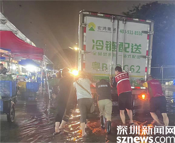 在蘭花社區(qū)豐湖大廈果蔬集散市場,有三輛農(nóng)產(chǎn)品運輸車拋錨,在接到求助信息后,蘭花社區(qū)黨委副書記鄒添文和其它值班同事立即趕往現(xiàn)場,冒雨將車輛推離市場?!皬?月11日上午9點,到5月12日上午9點,我一直在崗。我們對社區(qū)進行了全面排查,確保暴雨期間居民的生命和財產(chǎn)安全?!编u添文在接受記者采訪時表示,“凌晨三點,我們還在市場處理拋錨車輛,那時候也是雨勢最為迅猛的時候,雖然大家都變成了落湯雞,身上又冷又膩特別難受,但是看到車輛成功駛離,還是很有成就感的?!?/p>