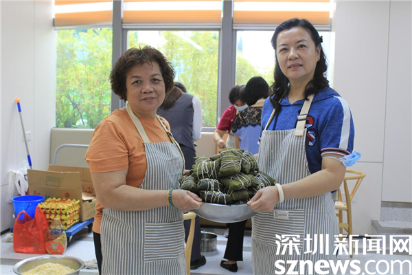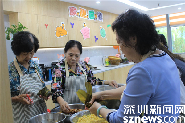 一起包粽子的30名“大廚”中,有社區(qū)居民,也有轄區(qū)企業(yè)員工。年齡最大的73歲,是老圍社區(qū)的蔡屋圍村民,年齡最小的25歲,是轄區(qū)企業(yè)員工。只見(jiàn)她們圍桌而立,雙手包著粽子,嘴里說(shuō)著家常,臉上帶著笑,沒(méi)多大工夫,一個(gè)個(gè)有棱有角的粽子就在大盆里堆成了小山。每一顆粽子都有家的味道,都帶著滿(mǎn)滿(mǎn)的祝福和對(duì)美好生活的憧憬。不少居民在老圍社區(qū)出生長(zhǎng)大,一住就是一輩子,她們見(jiàn)證了社區(qū)家園日新月異的變化,她們熱愛(ài)這塊土地,熱愛(ài)老圍社區(qū)。