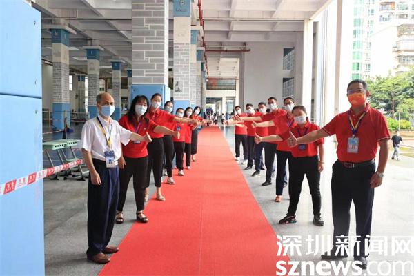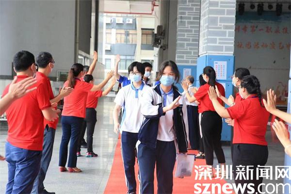 除了家長(zhǎng)的花式祝福外,老師們的加油行動(dòng)也是一道亮眼風(fēng)景線(xiàn)。羅湖翠園中學(xué)校長(zhǎng),高三年級(jí)主任身穿紅色送考服為考生加油。深圳市第一職業(yè)技術(shù)學(xué)校校領(lǐng)導(dǎo)和老師們?cè)诳忌亟?jīng)考場(chǎng)的路上,站成兩列縱隊(duì)等待著考生,當(dāng)考生經(jīng)過(guò)時(shí),老師們伸出手與考生擊掌,為考生加油。