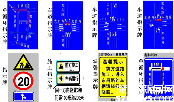 標(biāo)志標(biāo)線調(diào)整。東昌路等片區(qū)道路實(shí)施小范圍單循環(huán)后,涉及東昌路、太白路、東曉路、東湖路、昌曉一路等周邊道路標(biāo)志標(biāo)線重新調(diào)整,在施工上游路段設(shè)置施工提示牌,道路交叉口設(shè)置車道指示牌,提示過(guò)往車輛按照導(dǎo)行標(biāo)志標(biāo)線單向行駛。