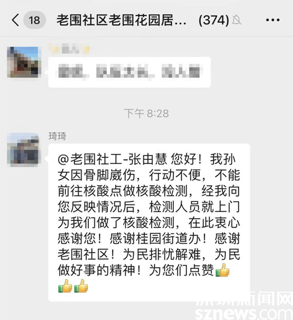 讀特客戶端·深圳新聞網(wǎng)2022年7月14日訊(記者 劉嘉敏 通訊員 楊紀歐)7月12日晚上8點多,羅湖區(qū)桂園街道老圍社區(qū)的居民琦琦在居民微信群里向社工張由慧說:“您好!我孫女因骨腳崴傷,行動不便,不能前往核酸點做核酸檢測,經(jīng)我向您反映情況后,檢測人員就上門為我們做了核酸檢測,在此衷心感謝您!感謝桂園街道辦!感謝老圍社區(qū)!為民排憂解難,為民做好事的精神!為你們點贊?!?/p>