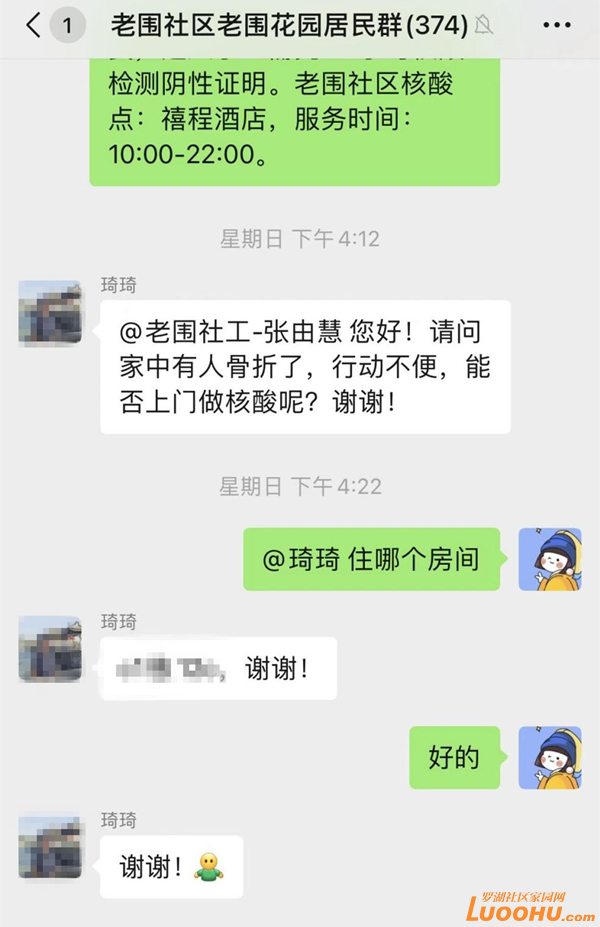 事情還要從7月10日的下午說起,正在家休息的張由慧,看到琦琦在社區(qū)居民群里求助:“@老圍社工-張由慧?您好!請問家中有人骨折了,行動不便,能否上門做核酸呢?謝謝!”張由慧立刻回復:“您的房間號(是什么)?”得到房間號后,張由慧通知社區(qū)網(wǎng)格員肖祥昌協(xié)助核實情況。肖祥昌從網(wǎng)格系統(tǒng)中找到琦琦的聯(lián)系方式,一通電話后,了解到琦琦的孫女不小心崴傷了腳,行動不便,無法下樓做核酸。肖祥昌把情況通報給張由慧,張由慧立刻向社區(qū)黨委副書記黃小龍做了報備。