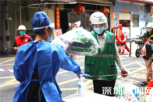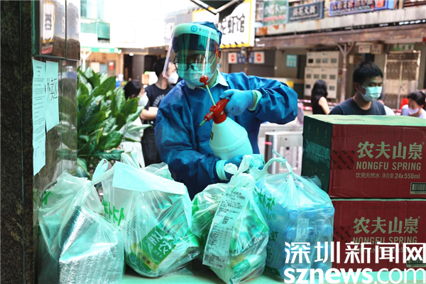 8月29日下午,深圳新聞網(wǎng)記者來到羅湖區(qū)南湖街道文錦社區(qū)凱悅?cè)A庭,只見小區(qū)居民正保持著一米距離有序地進行核酸檢測,身穿防護服的“藍墩墩”在一旁忙碌著。記者在現(xiàn)場看到偶有“騎士”將居民在網(wǎng)上商城所下單的物資像傳送接力棒一樣交到“藍墩墩”的手上,“藍墩墩”接過之后,立即進行全方位的消殺工作。