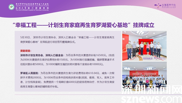 今年初,深圳市計劃生育協(xié)會、人口基金會就創(chuàng)建了一項(xiàng)“幸福工程”,旨在為計劃生育家庭再生育提供幫助。今年5月30日,第一個幸福工程基地就選擇坐落于羅湖醫(yī)院,項(xiàng)目為符合條件的夫妻提供總額高達(dá)16500元的醫(yī)療補(bǔ)貼,同時,羅湖醫(yī)院還給予相應(yīng)的醫(yī)療減免,包括手術(shù)及藥品費(fèi)用的配套補(bǔ)貼。為居民再生育提供了很好的幫助,大大降低了經(jīng)濟(jì)壓力,讓更多的家庭愿意再生育。
