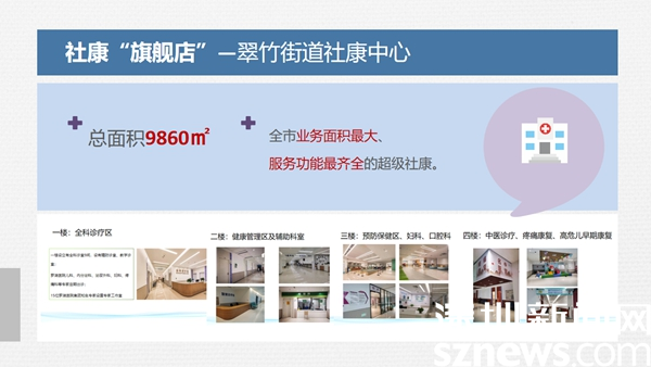 2021年3月,全市業(yè)務(wù)面積最大、服務(wù)功能最齊全的羅湖醫(yī)院集團(tuán)翠竹街道社康中心投入使用??偯娣e9860平方米共有4層,分設(shè)不同功能區(qū)。一樓為診療區(qū),涵蓋全科診療區(qū)、專家工作室、醫(yī)學(xué)影像檢查區(qū)等;二樓為健康管理區(qū),為居民提供全周期的健康體檢及檢后健康管理服務(wù),還設(shè)有超聲、檢驗(yàn)、DR等科室;三樓為預(yù)防保健區(qū),口腔科、婦科,四樓為高危兒早期康復(fù)中心、名中醫(yī)館、中醫(yī)康復(fù)理療區(qū)。