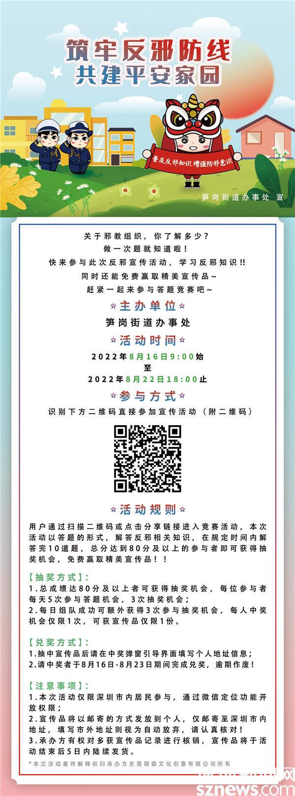 為做好反邪教警示教育宣傳工作,引導(dǎo)轄區(qū)內(nèi)居民進(jìn)一步認(rèn)清邪教危害,提高反邪教意識(shí)和能力,營造“無邪羅湖、和諧社區(qū)”濃厚氛圍,筍崗街道持續(xù)開展以“防范邪教侵害、守護(hù)平安家園”為主題的反邪教宣傳系列活動(dòng),實(shí)現(xiàn)反邪教宣傳全覆蓋。