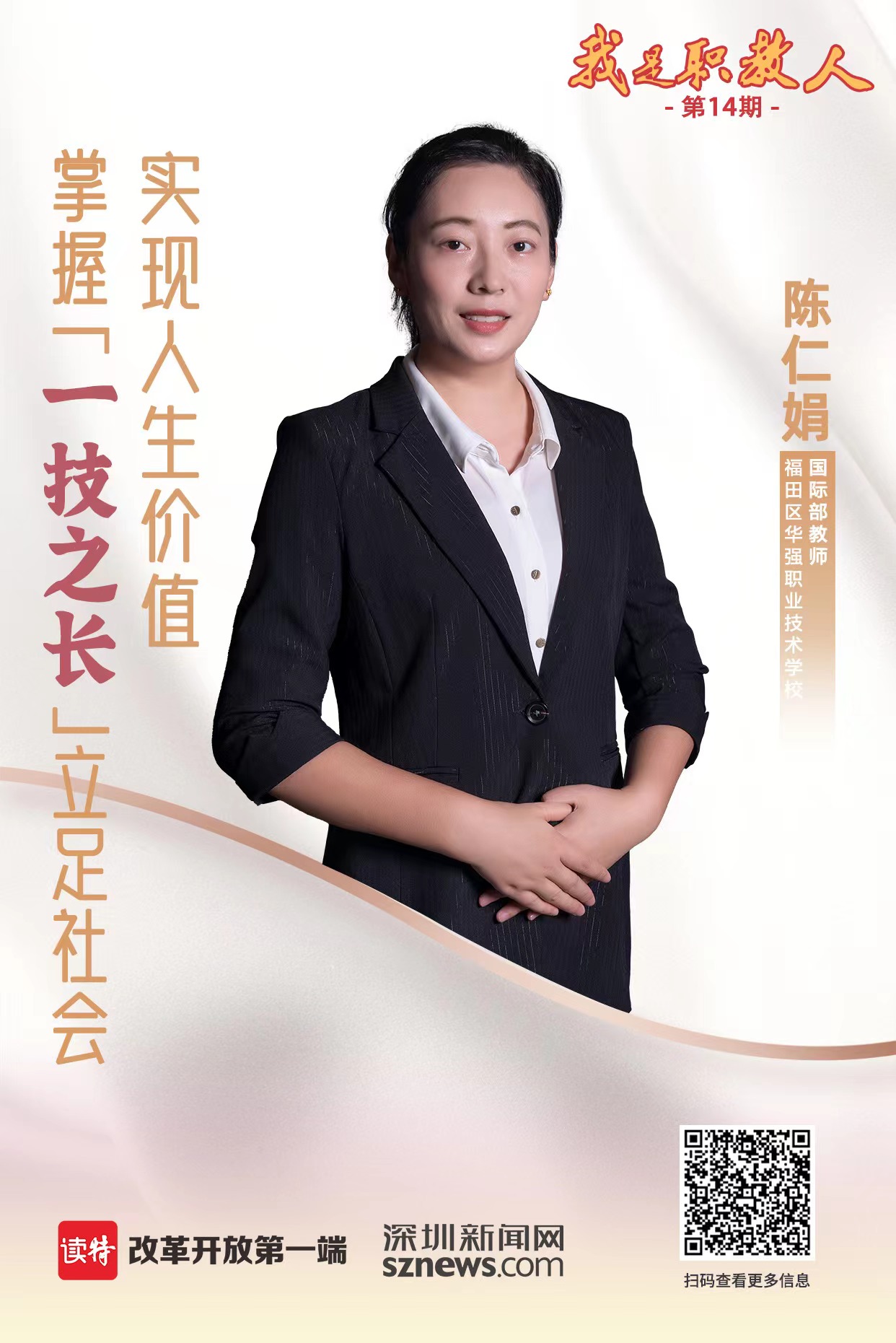 抱著對教師行業(yè)的熱愛和教書育人的向往,深圳市福田區(qū)華強職業(yè)技術(shù)學校國際部教師陳仁娟,畢業(yè)后遵循從教初心,成為職教老師至今已有九年。