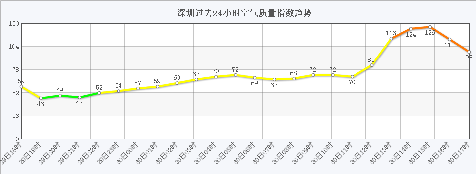 PM2.5監(jiān)測(cè)網(wǎng)數(shù)據(jù):深圳空氣指數(shù)全天最差的時(shí)段是下午三點(diǎn)。