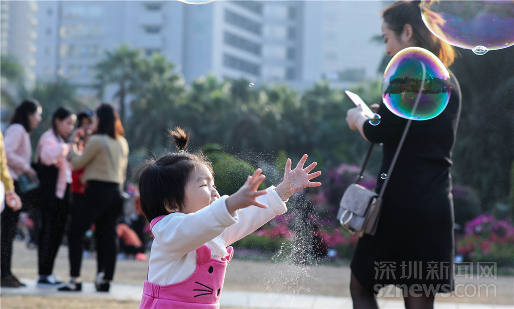 孩子在廣場上追著泡泡開心地玩耍著