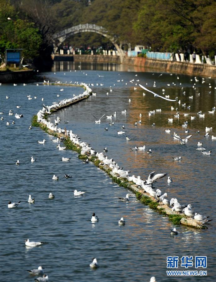 3月13日,即將返鄉(xiāng)的紅嘴鷗在昆明大觀河上嬉戲。 新華社記者藺以光攝