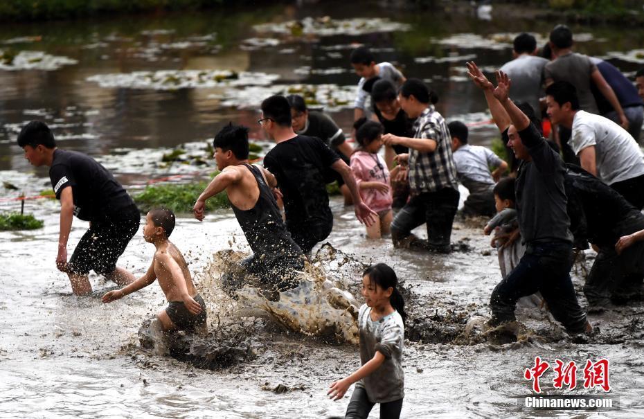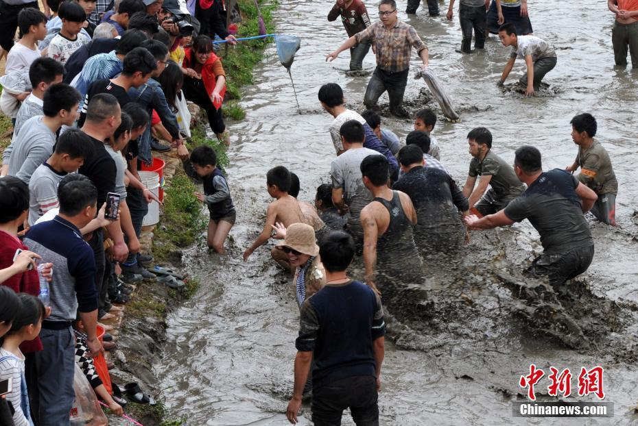 3月17日,福建省龍巖市連城縣莒溪鎮(zhèn)璧洲古村落內(nèi),一場(chǎng)“抓魚鬧春田”的活動(dòng)吸引了許多市民前來參與。圖為民眾在泥塘的渾水中抓魚。中新社記者 張斌 攝