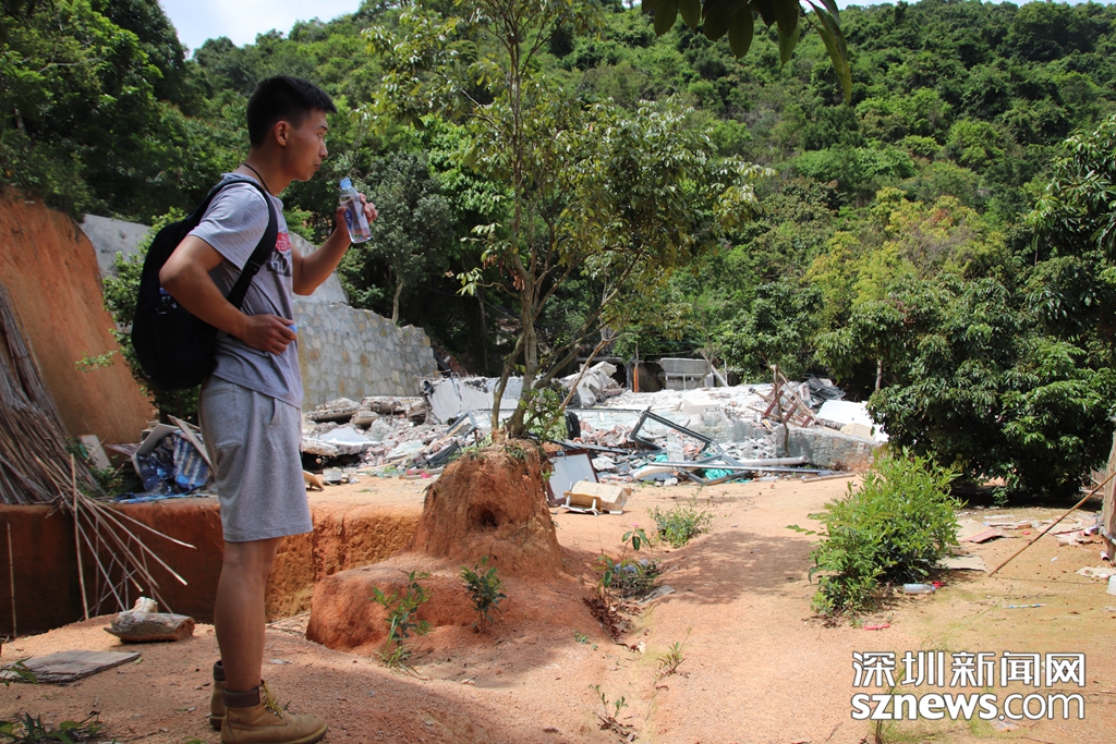5月16日,深圳新聞網(wǎng)記者爬上羊臺山,用無人機和相機拍下羊臺山毀林案件涉案的兩棟違法建筑拆除后的情景。記者從羊臺山隱蔽的一處登山,山路崎嶇且陡峭,沿路都是荔枝林,多頭大型犬見到陌生人狂吠不已。耗時三四十分鐘登臨山腰,可俯瞰西麗水庫,視野極佳。