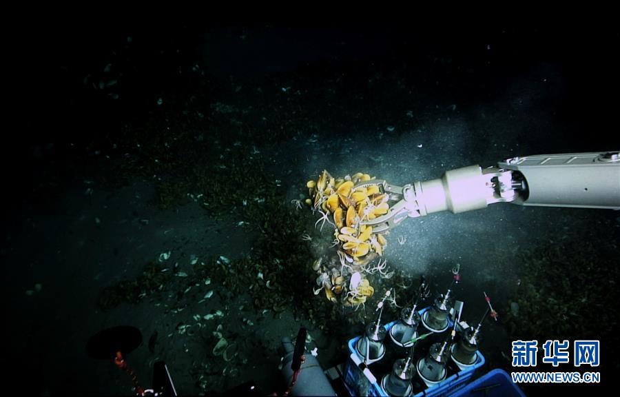 “深海勇士”號在“海馬冷泉”進行科學(xué)采樣的情景(5月20日攝)。新華社記者 張建松 攝