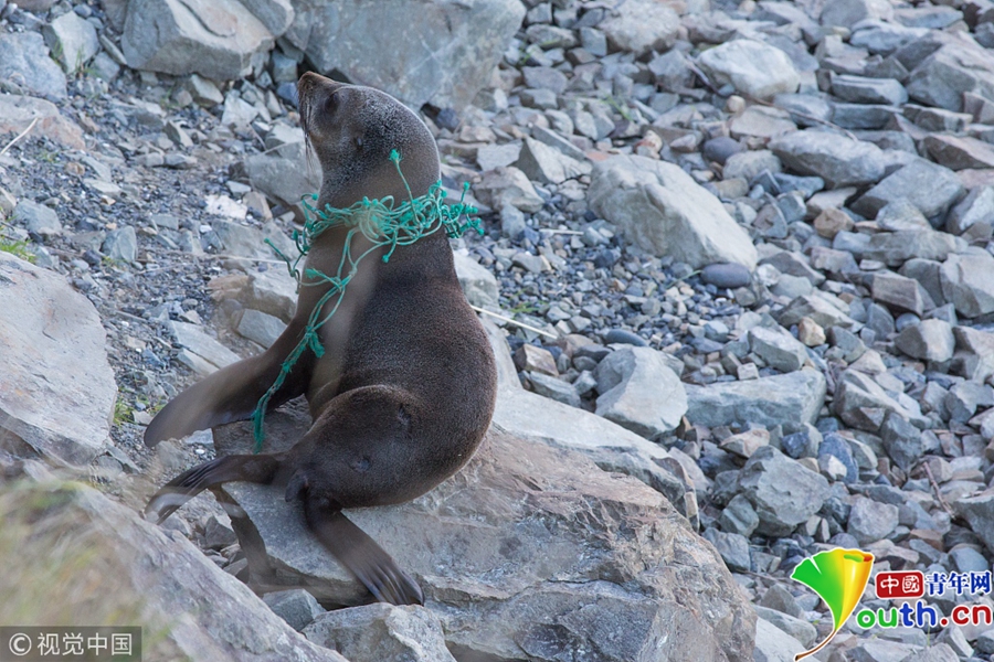 海邊海豹被漁民丟棄的繩子套住脖子。